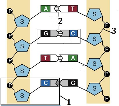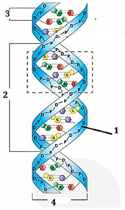 b. Cấu trúc (1) là liên kết hóa trị. Cấu trúc (2) là 1 chu kì xoắn có kích thước là 3,4 micromet.