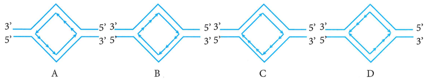 (1)-đầu 3’; (2)- đầu 3’;(3)- đầu 5’; (4)-đầu 3’; 5- chiều tháo xoắn..