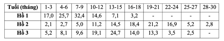 Để đánh giá tiềm năng khai thác quần thể cá trê ở 3 hồ nước ngọt có điều kiện tự nhiên tương đương nhau, người ta đã sử dụng cùng một cách đánh bắt, ở cùng một thời điểm rồi phân loại số cá bắt được theo nhóm tuổi (tính theo tỷ lệ %). Biết rằng, tuổi thành thục sinh sản của cá trê là 12 – 15 tháng và số lượng cá đánh bắt ở 3 hồ trong nghiên cứu đảm bảo tin cậy về thống kê. Kết quả điều tra được trình bày ở bảng dưới đây.