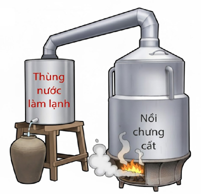 - Đun nóng hỗn hợp trên đến nhiệt độ sôi, hơi bay ra đi vào đường ống dẫn. Hỗn hợp hơi trong đường ống được làm lạnh sẽ hoá lỏng và chảy vào bình hứng (như hình vẽ):