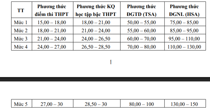 Nhà trường sử dụng phương thức điểm thi THPT làm gốc và áp dụng công thức quy đổi tuyến tính cho 5 mức điểm giữa các phương thức khác (Học bạ, TSA, HSA):
